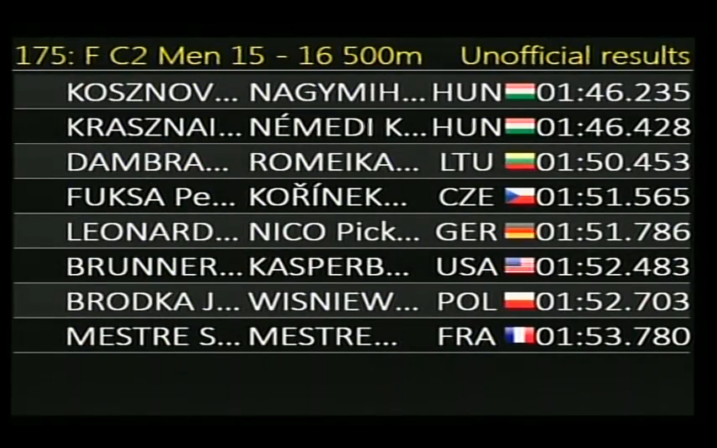 Következett a 15-16 évesek férfi C2 1000 méteres versenye, ahol Nagymihály Levente és Kosznovszki Gergely miatt voltunk érdekeltek. Duónk megnyerte a futamát, így nekik is csak a döntőre kellett koncentrálniuk. A fináléban egy nagyon izgalmas befutót követően a harmadik helyen végeztek (első a Krasznai Péter-Tóth János páros lett).